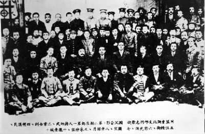 ▲1912年4月蒋翊武(2排左1)与孙中山(2排左7)等在武昌合影。