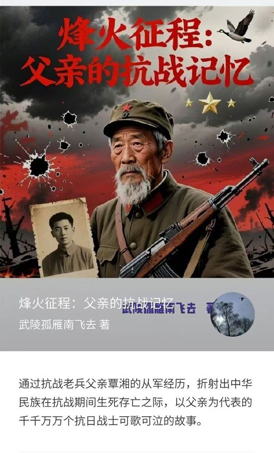 武陵源区融媒体中心1月8日讯(通讯员 屈泽清)日前,由覃正波(笔名“武陵孤雁南飞去”)创作的纪实作品《烽火征程:父亲的抗战记忆》正式上线。作品以其父亲——张家界市武陵源区籍抗战老兵覃湘的真实回忆录为蓝本,讲述了普通战士在民族危亡之际的热血抉择与烽火人生。