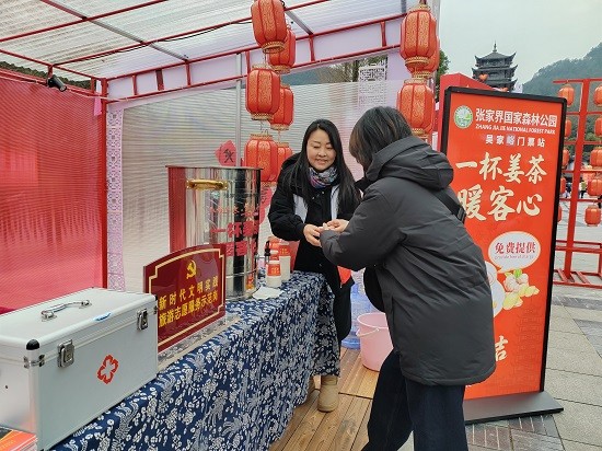 武陵源区融媒体中心2月19日讯(通讯员 罗接生)2月19日,吴家峪门票站年味正浓、客流有序。为更好服务春节假期八方游客,门票站将党员咨询台前移至标志门广场,同步开展“一杯姜茶暖客心”服务活动,以党建引领提升服务温度,让游客在新春旅途感受贴心关怀。