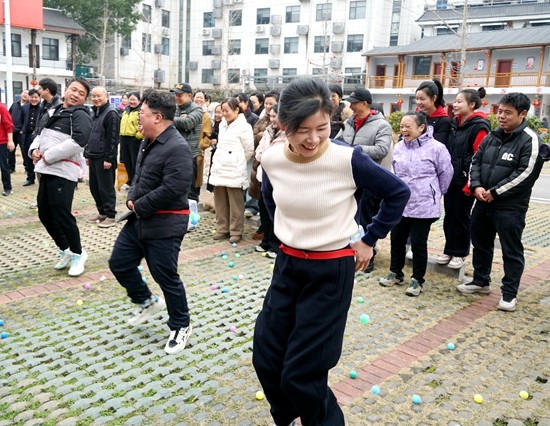 趣味游戏区同样热闹非凡,“公鸡下蛋”环节中,队员们随着音乐节奏努力抖动身体,试图让盒子里的乒乓球尽快“下蛋”,各种“舞姿”引得观众捧腹大笑。“马到成功”游戏里,队员们举着扇子左扑右赶,当小马“哒哒”冲进马厩时,欢呼声与笑声此起彼伏。