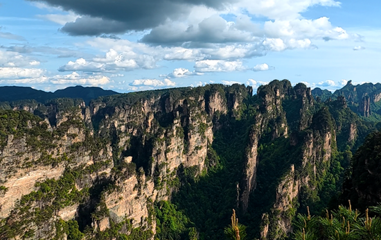 走进杨家界景区,连片峰墙次第排布、错落有致,横看成墙、侧看成峰,与蓝天白云相映成趣,绘就一幅壮阔秀美的山水画卷。游客们沿着步道缓缓前行,远眺层峦叠翠,近距离感受峰墙纹理,纷纷拿出手机、相机记录下这震撼人心的美景。