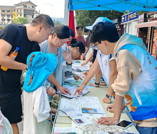 活动中,各服务台志愿者坚守岗位、热情服务,耐心细致地向游客讲解景点路线、发放旅游指南与手绘地图、协助拍照留念,并在关键节点进行分流指引。来自黑龙江的两位老人在吴家峪门票站咨询时,志愿者不仅为其规划适合的游玩路线,还协助完成门票预约,两分钟内解决所有问题,获老人连连称赞。