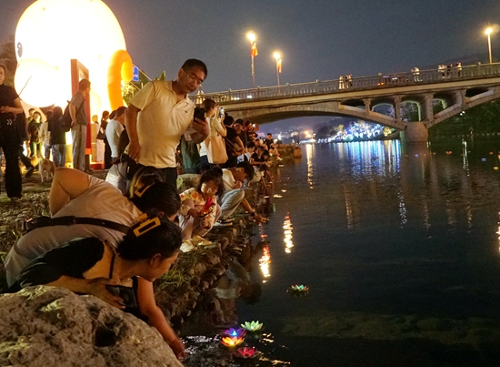 最为温馨动人的场景,莫过于索溪河畔的放河灯祈福仪式。在指定的安全水域,游客们纷纷领取环保的电子河灯或荷花灯,轻轻放入水中。点点暖光随波摇曳,映照着水面,也映照着人们虔诚的面容。“愿父母身体健康,孩子学业进步,国家繁荣昌盛。”来自长沙的游客李先生道出了许多放灯者的心声,盏盏河灯承载着对家人的深切思念和对未来的美好祈愿。