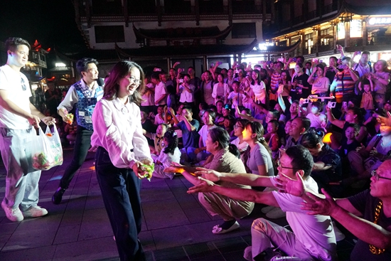 丰富的互动体验环节将节日氛围推向高潮。工作人员穿梭在人群中,将象征团圆的月饼递送至市民游客手中,传统佳节的祝福在现代场景中传递,笑语欢声不绝于耳。