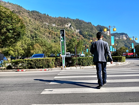 在黄龙洞景区路段,行人过街安全预警系统成了游客的“贴身保镖”。“以前过马路总担心被大巴车挡住视线,现在有了这个系统,车子就自动检测减速了!”多次来武陵源旅游的李女士说。这套融合视频处理、AI算法和5G传输技术的系统,能敏锐识别行人过街意图,既会对行人进行声光提示,还会在来车方向的诱导屏同步预警,提醒司机及时减速礼让,从源头化解人车混行风险。