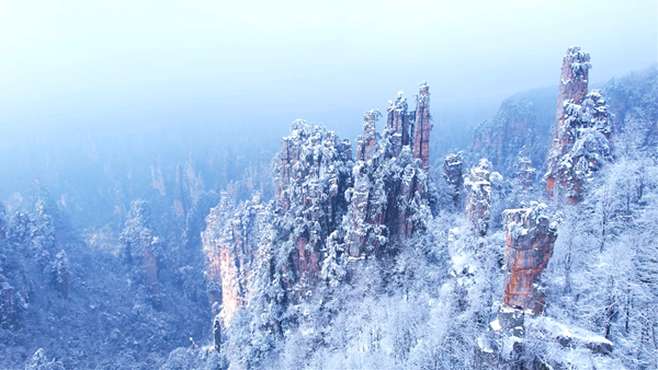 “春有百花秋有月,夏有凉风冬有雪”。四季轮转中,冬日的武陵源,是大自然以冰雪为笔勾勒的奇幻秘境。当雪花飘落,张家界国家森林公园便褪去葱茏,换上银装,漫山树枝缀满晶莹剔透的树挂,峰林、峰墙在白雪覆盖下更显雄奇,随手定格,便是氛围感拉满的冬日大片。